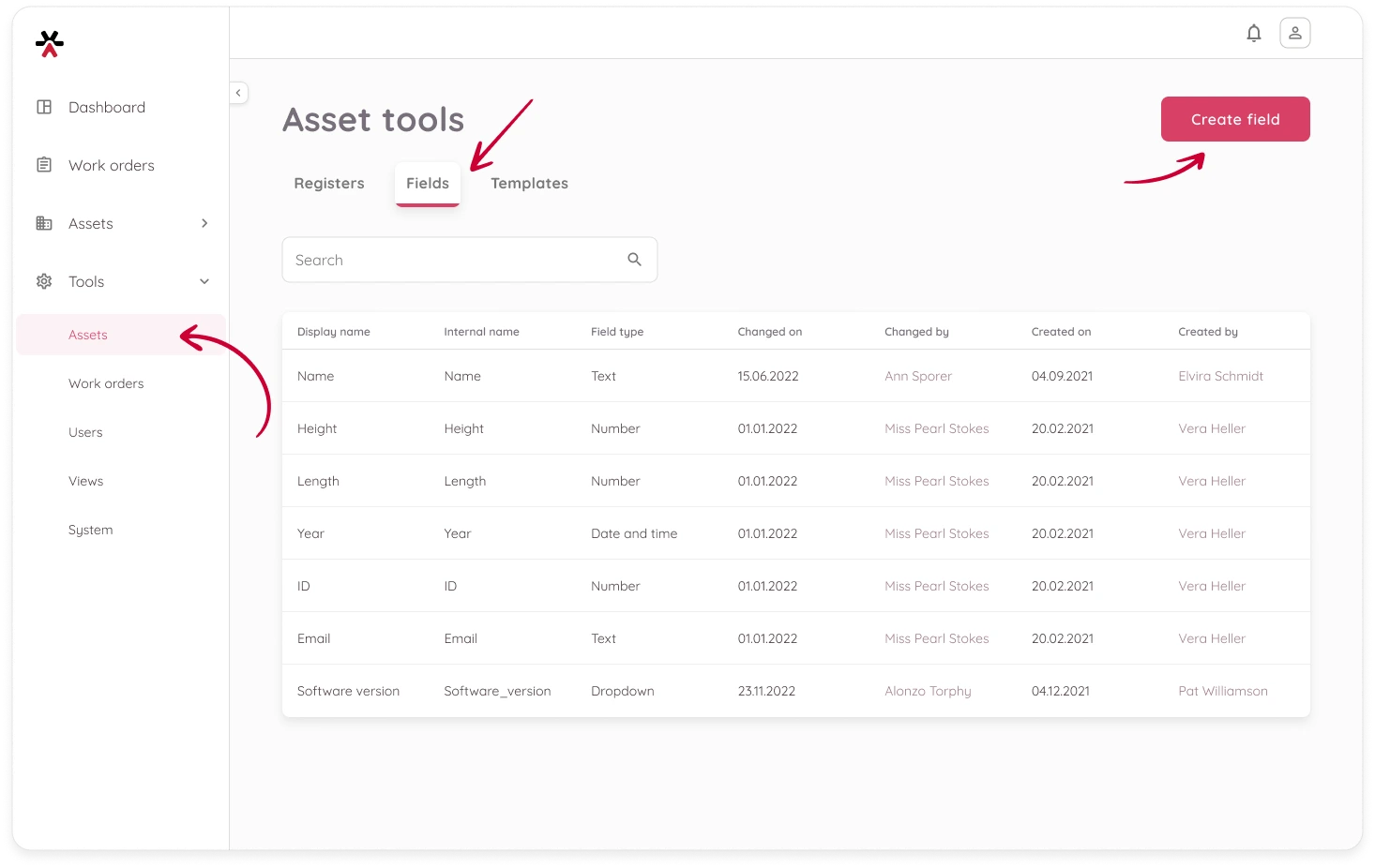 1. Go to Tools > Assets > Fields or Tools > Work orders > Fields or Tools > Users > Fields