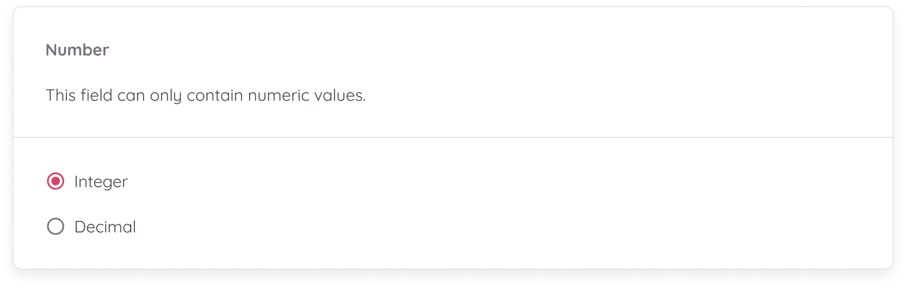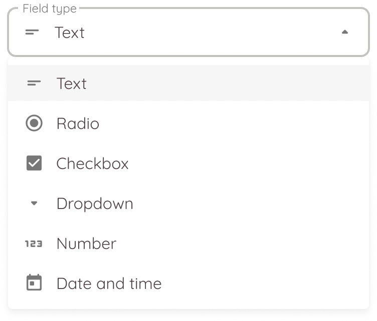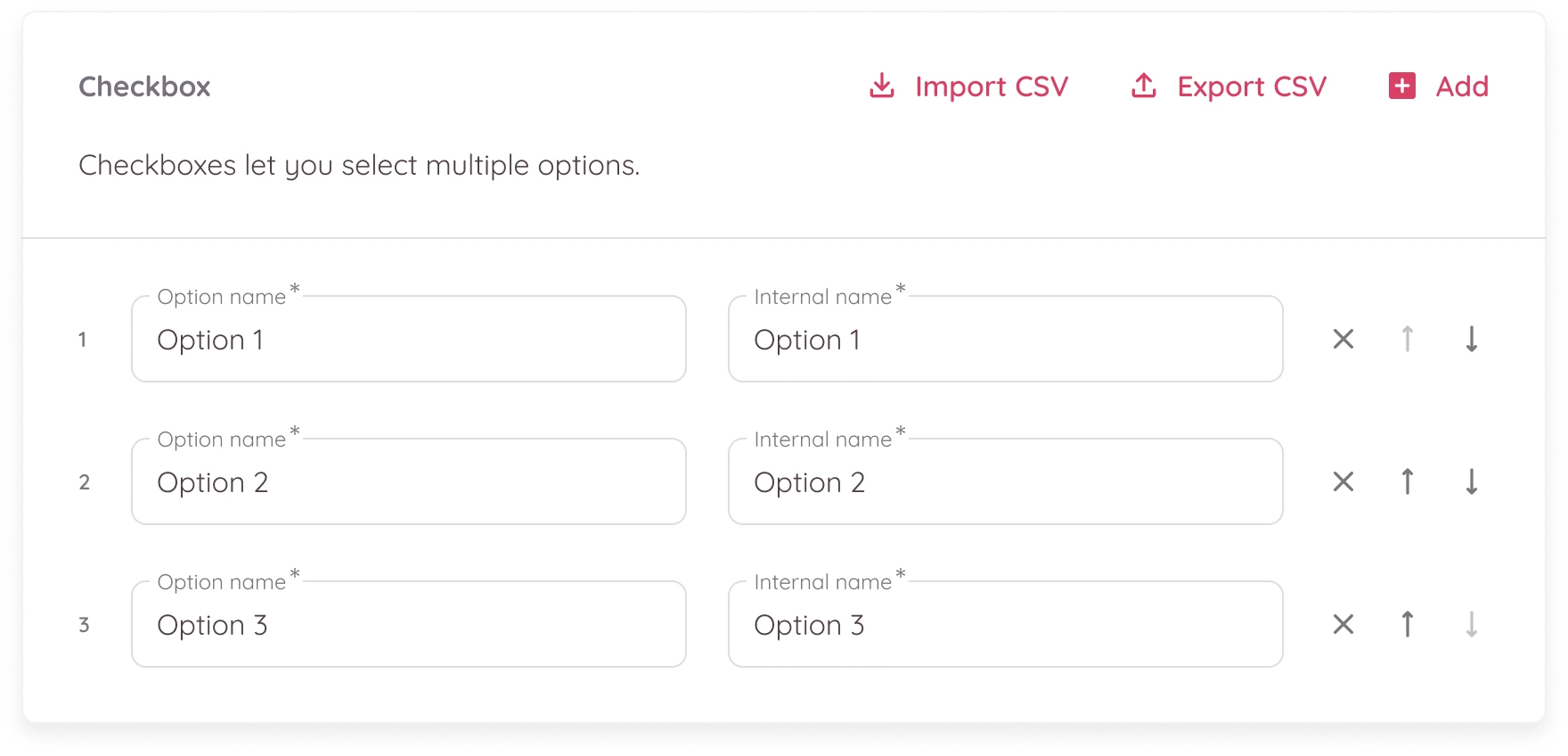 Used for binary yes/no inputs or selecting multiple values. Best suited for small sets of options. You can manually enter options, reorder them, or import from a CSV file.