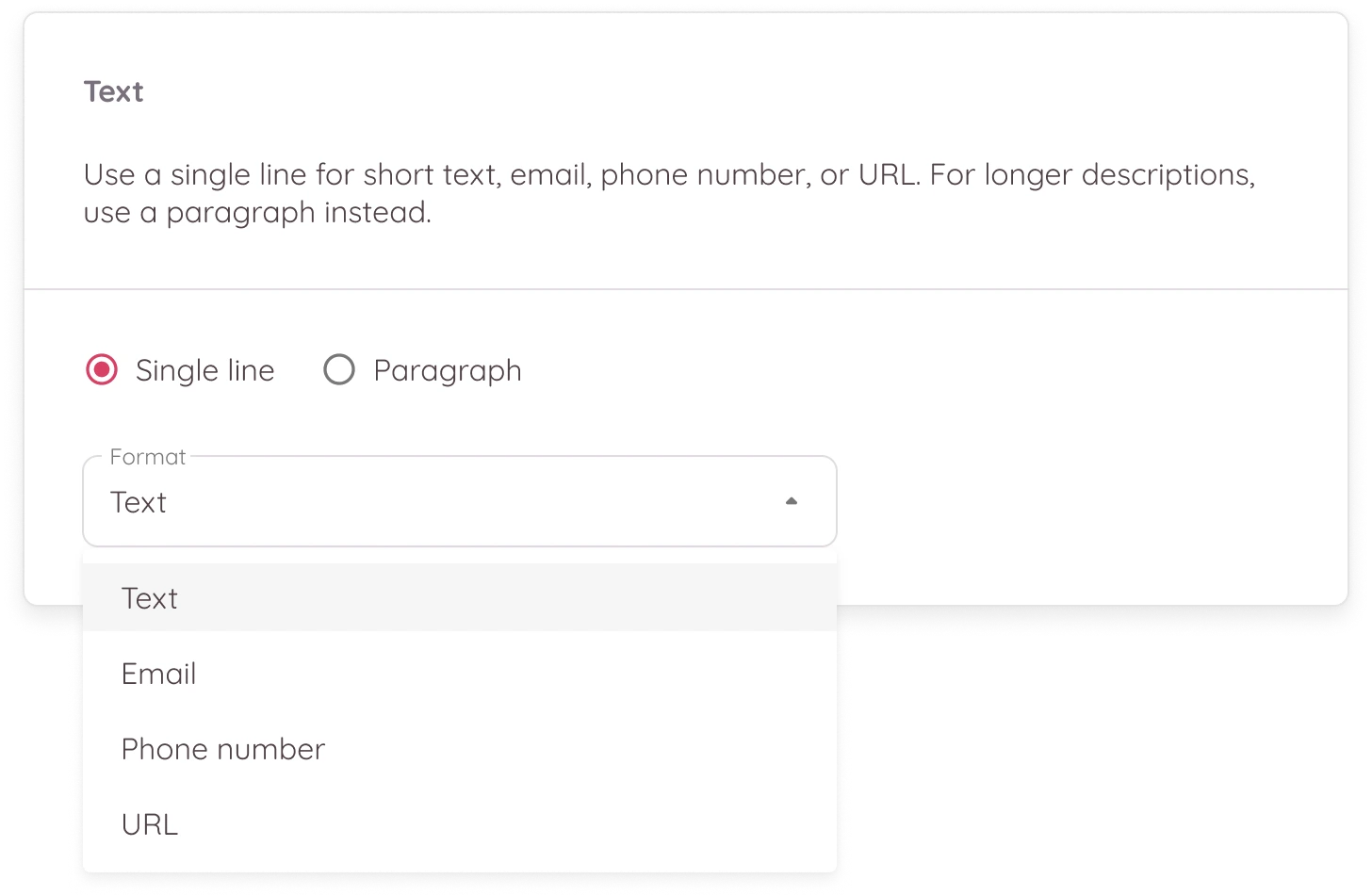 • Field-specific parameters (e.g. single line vs paragraph for text fields)