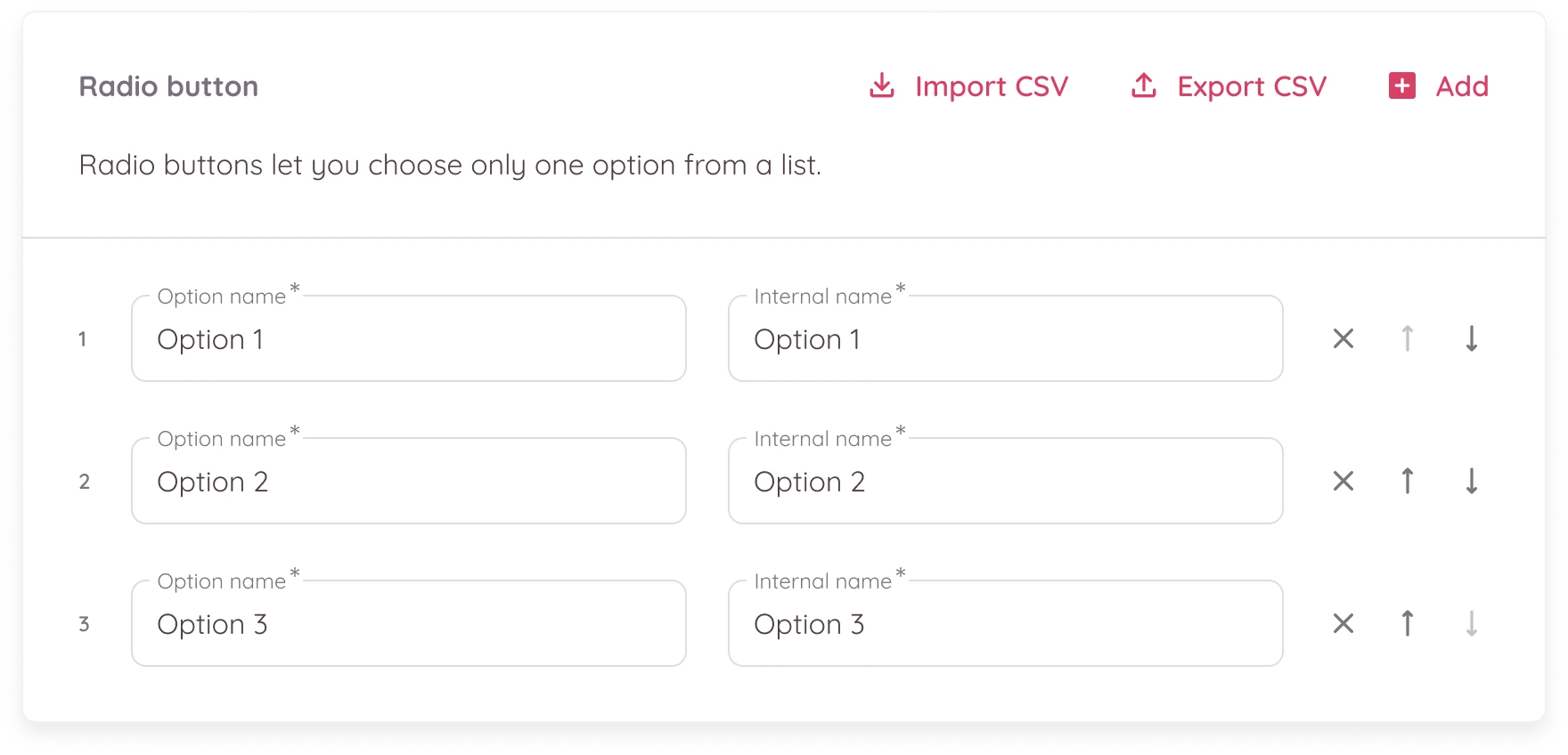 Allows users to select one option from a predefined list. You can manually enter options, reorder them, or import from a CSV file. A radio button field must have at least two options.