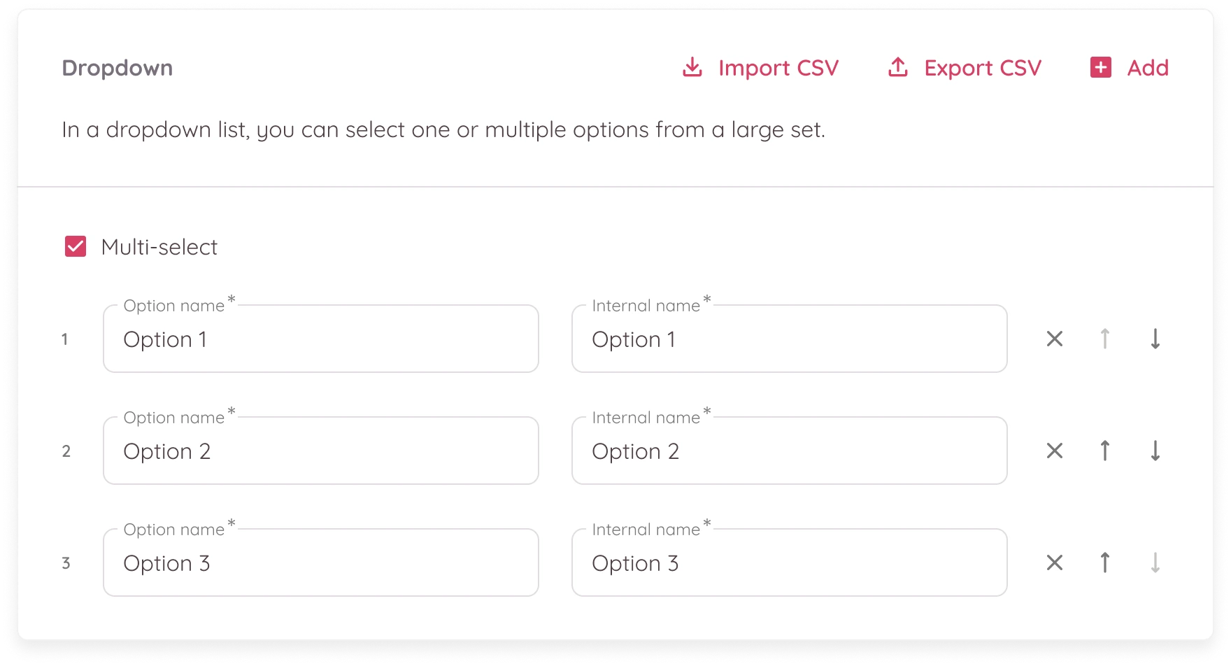 Provides a list for selecting one or multiple options from a larger set. You can manually enter options, reorder them, or import from a CSV file. A dropdown field must have at least two options.