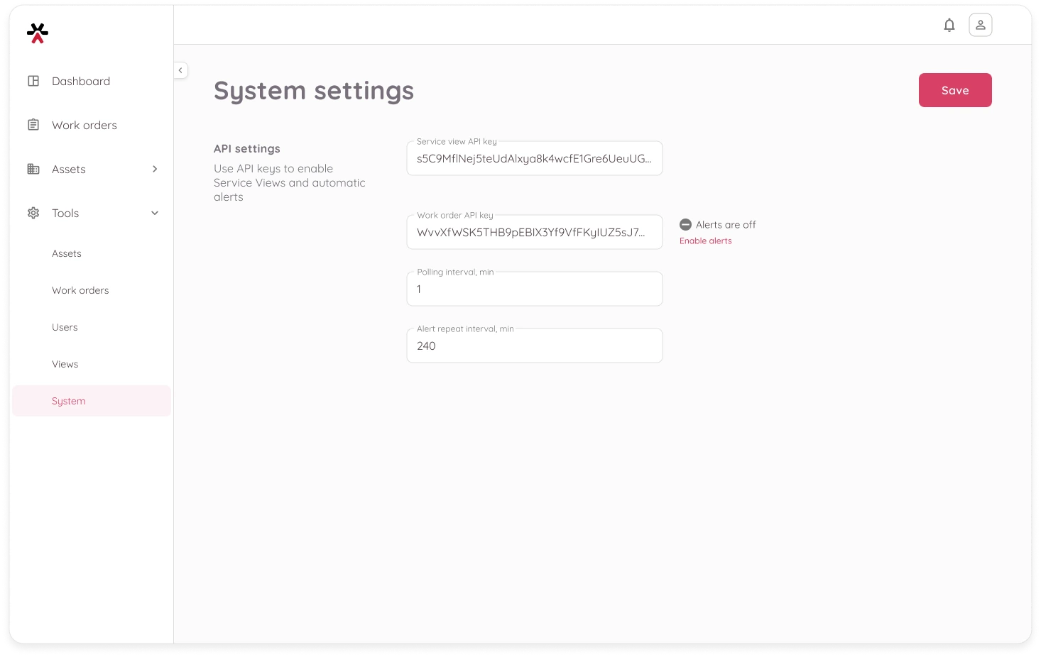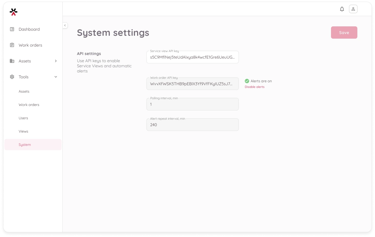 Use API keys to connect to external systems. This enables integrations like Service View dashboards and automatic work order creation.